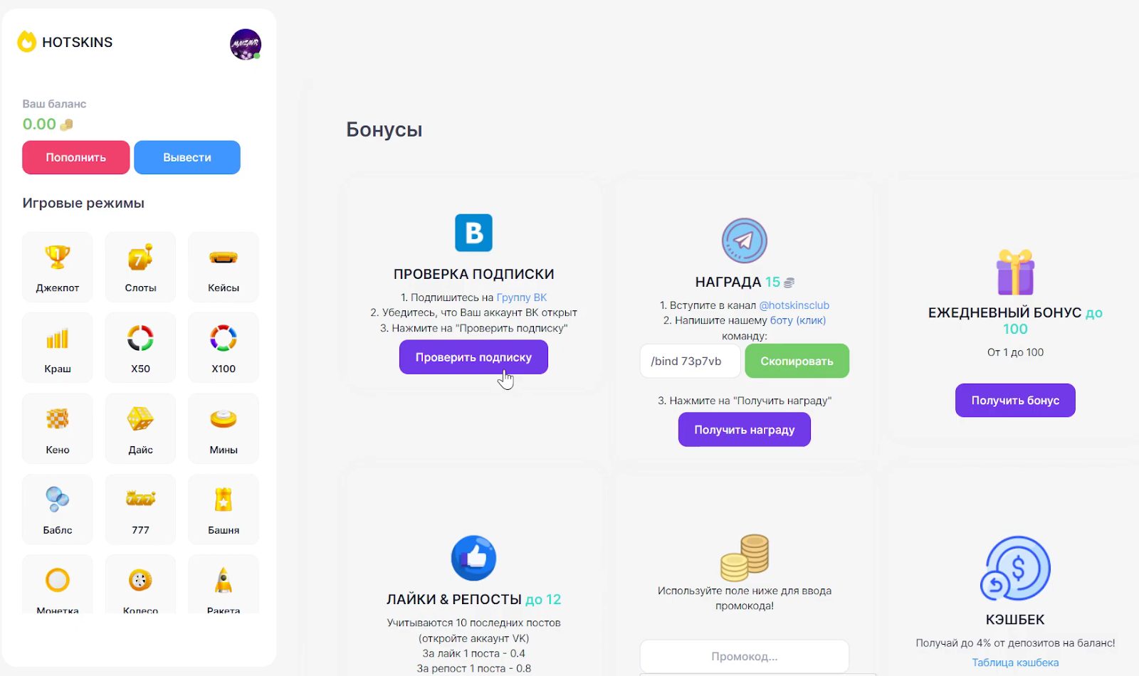 Игра на сайте Hotskins tech представляет собой достаточно обширный проект, в котором пользователям доступно несколько отдельных мини-игр. Просто так сыграть в них не получится, так как требуется пополнение счета. Новички могут получить стартовый бонус, а также вознаграждения за определенные действия. В частности, нужно подписаться на группу ВКонтакте, поставить лайк или сделать репост, подписаться на канал в Телеграм Hotskins и прочее. Тут предполагается начисление ежедневных бонусов. За пополнение счета будут начисляться дополнительные деньги на счет.