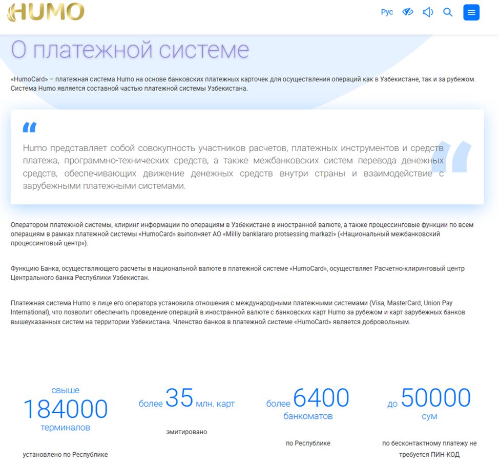 Национальная платежка работает в Узбекистане, но обслуживает и резидентов других государств. Популярность объясняется большой интеграцией – услугами сервиса пользуются многие банки и магазины. Платежная система «Хумо Кард» обслуживает более 35 000 000 карт и позволяет получать платежи, отправлять переводы и оплачивать счета и покупки. Сервис выпускает пластиковые и бесконтактные платежные инструменты для обычных людей, семей, студентов и бизнеса.
