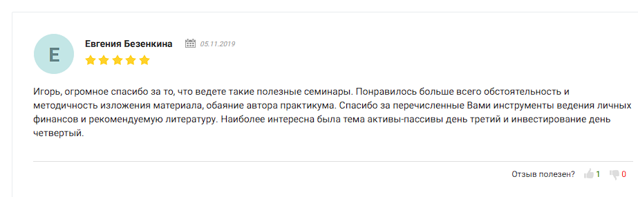 Фидбэков об обучении у этого специалиста мало. Мы нашли единичный положительный отзыв на агрегаторе курсов investcourses – в нём клиентка благодарит Подопросветова за полезный семинар, хвалит методичное изложение материала и отмечает интересные для себя темы: