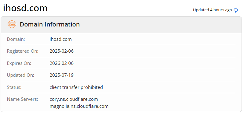 Сразу начнем с проверки возраста домена. Она показывает, что сайт ihosd com начал работать лишь в 2025 году: