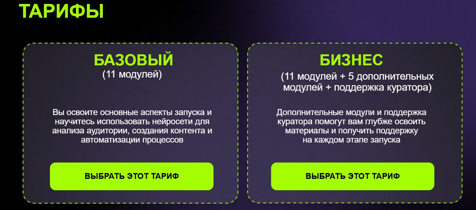 Есть базовый и бизнес тарифы. В них входят 11 модулей и дополнительные модули и поддержка в бизнес-варианте. Обещают обучение базовым аспектам и созданию контента через ИИ.