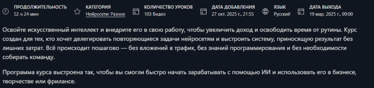 На сайте и в других социальных сетях автора, сообщается, что приобрести нейросетевой курс Ильи Палия в Телеграм и других каналах можно, написав автору лично. При этом Илья не пишет, сколько именно стоит доступ к его курсам ни на каналах, ни на сайте. Говорится лишь о том, что обучение подойдет новичкам, экспертам и бизнесменам. Доход после прохождения обучения обещают от ₽100,000 до ₽300,000. Для подробностей нужно записаться на консультацию.