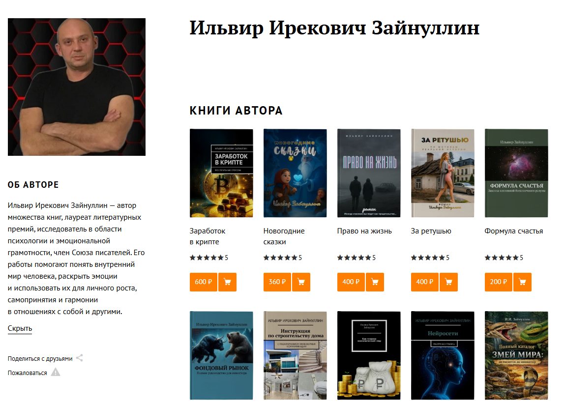 Мы не нашли подробной биографии автора, но из публичных источников известно, что Ильвир является автором нескольких книг — не только по криптовалюте и заработку, но и детских сказок, художественных произведений, руководств по строительству и архитектуре. Также пишут, что Зайнуллин является членом Союза писателей. О его профессиональном опыте как трейдера ничего неизвестно. Себя автор называет исследователем в области психологии и криптовалют.