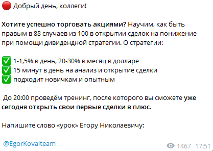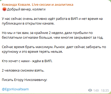 Трейдер Илья Коваль активно зазывает подписчиков в свой «вип-канал», где обещает давать людям «еще более прибыльные сигналы». Чтобы присоединиться к этому сообществу, подписчик должен написать в личку некоему «Егору Николаевичу» с ником @ EgorKovalteam. Однако мы ничего о нем не знаем. Начав переписку с потенциальным мошенником, есть риск потерять свои деньги, поддавшись на его манипуляции.