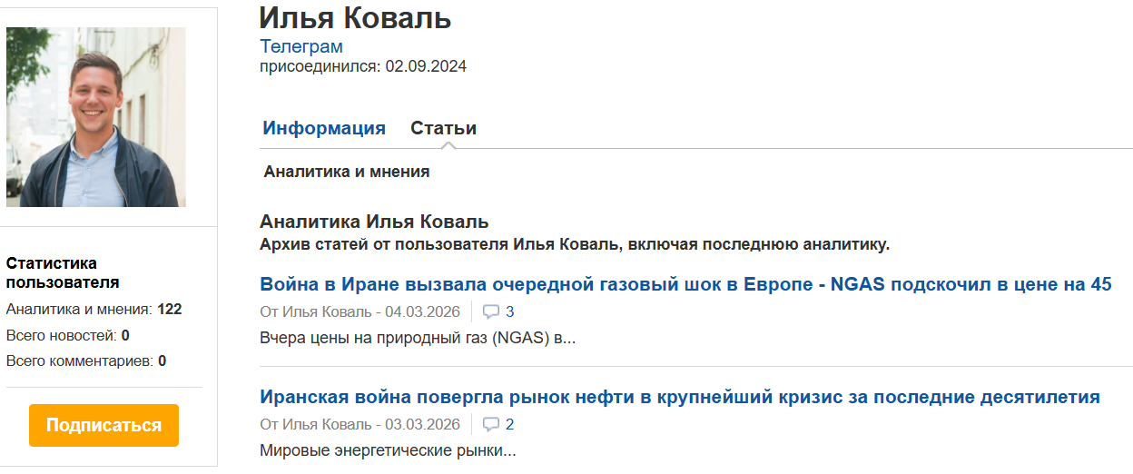 Коваль зарегистрирован на сайте Investing Com. Он написал там около 100 статей, в основном посвященных геополитике. Например, последние материалы, вышедшие в 2026 году, касаются войны на Ближнем Востоке.