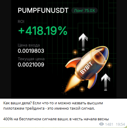 Во второй записи админ информирует, что Илья получил доходность 400% от крипты PUMPFUN. При этом он нигде не рассказывает о своих неудачных сделках, которых невозможно избежать, торгуя столь волатильными активами. Это крайне подозрительно.