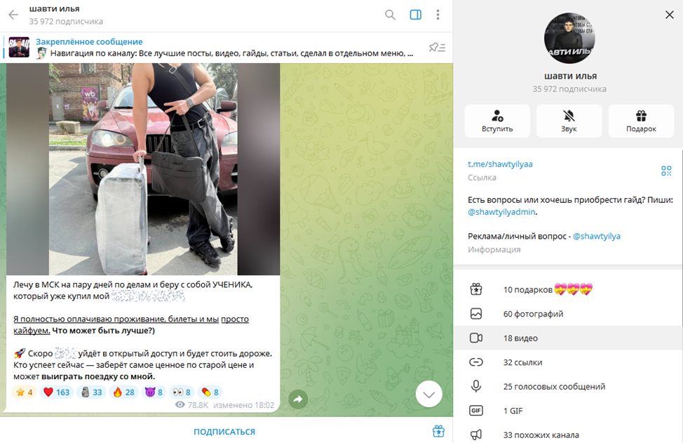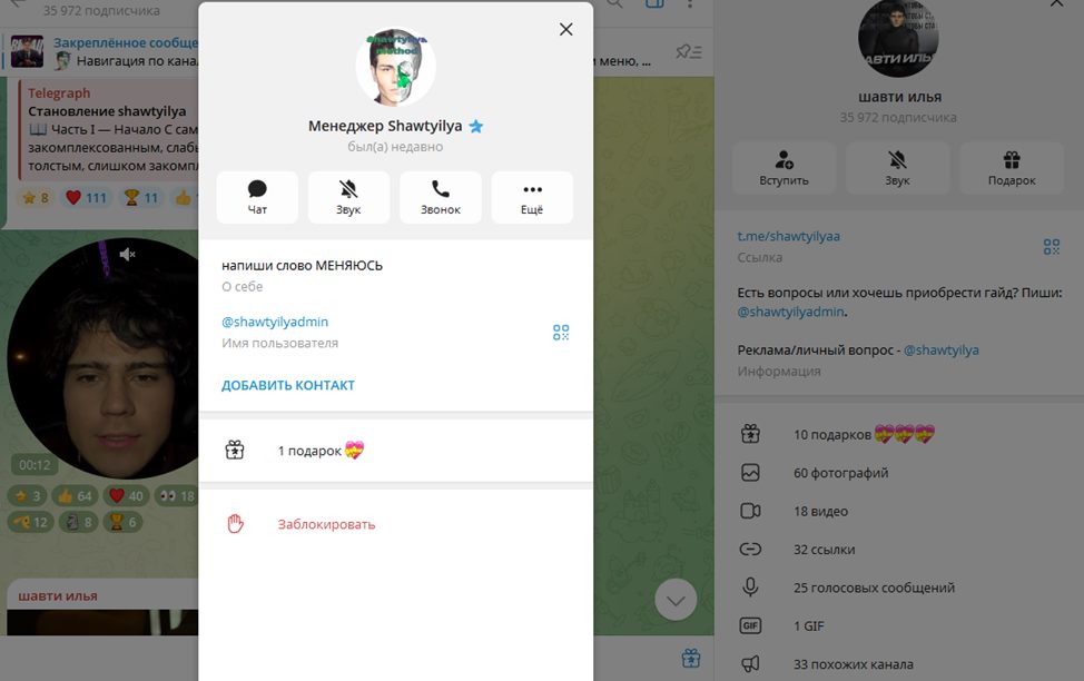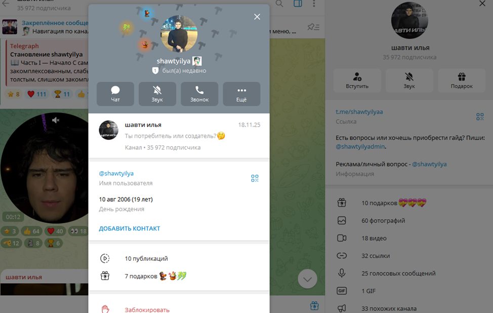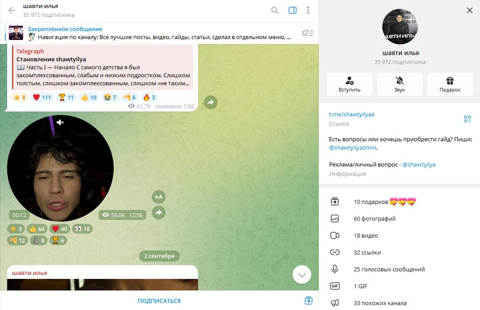ТГК «Шавти Илья» расположен по адресу @ shawtyilyaa и на 25 ноября 2025 года имел 35 тыс. подписчиков. Посты выходят нерегулярно, владелец группы часто делает перерывы в 1–2 месяца. Несмотря на информационные провалы, за лентой следит более 70 тыс. человек, что говорит об определенной популярности идей «эксперта».
