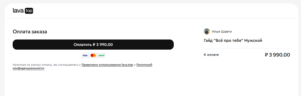 Стоимость комплекса — 3990 рублей. Для формирования счета необходимо зайти в телеграм-бот «Шавти Илья», действующий по адресу @ Shawtyguide Bot, и указать адрес электронной почты для отправки реквизитов. Оплату принимают через сервис Lava Top без указания реквизитов ИП или компании, предоставляющей услуги. Отсутствие юридической информации указывает на незаконную коммерческую деятельность автора ТГК.