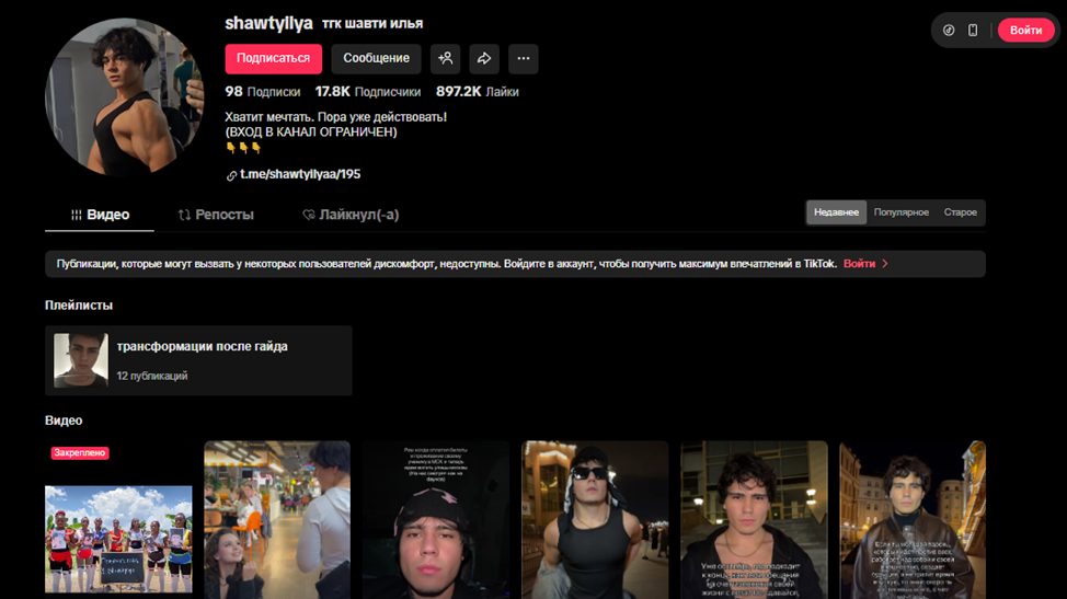 За пределами Telegram Илья ведет Тик-Ток @ Shawty Ilyaa. Профиль имеет 17 тыс. подписчиков, но мотивирующие ролики охватывают аудиторию в 25–50 тыс. человек.
