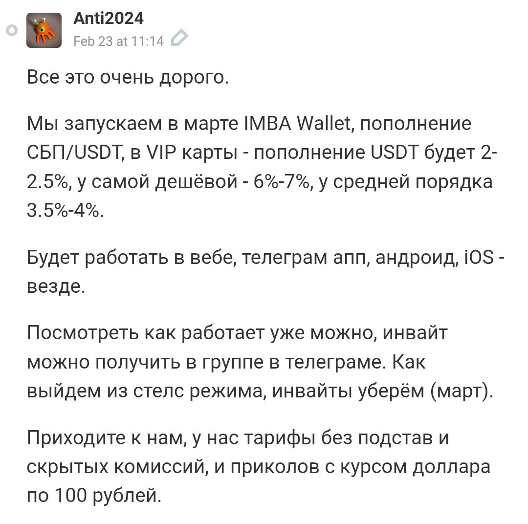На профильных форумах, в чатах трейдеров и в агрегаторах мнений нет прямых отзывов о работе Imba wallet. Вместо пользовательских рецензий присутствует только самопрезентация. Можно найти статьи в собственном блоге создателя, посты в телеграмм-канале и рекламные тезисы о легкости обхода валютных препятствий.