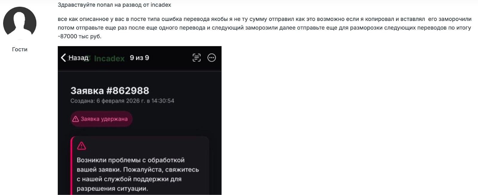 Если переключиться на независимые форумы, на Incadex отзывы заметно меняют окрас. Люди описывают один и тот же сценарий: они создавали заявку, отправляли крипту и через пару минут получали сообщение об «удержании заявки» в связи с загадочной ошибкой.