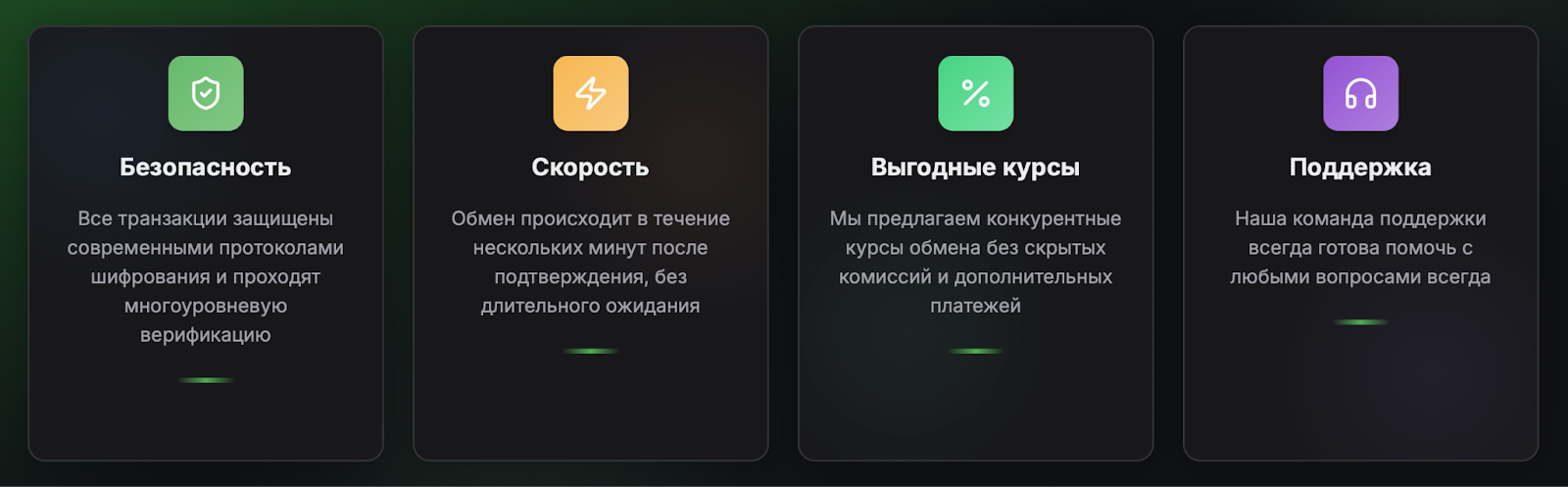 Комиссии подробно не расписаны и не выделены отдельно. В FAQ сказано, что комиссия за обмен уже включена в курс, который показывает калькулятор. Дополнительно плата взимается за сетевую комиссию при отправке из своего кошелька — это стандартная плата блокчейна. Скрытых платежей якобы нет, но точные проценты или фиксированные суммы нигде не указаны. Все зависит от текущего курса, который обновляется в реальном времени.
