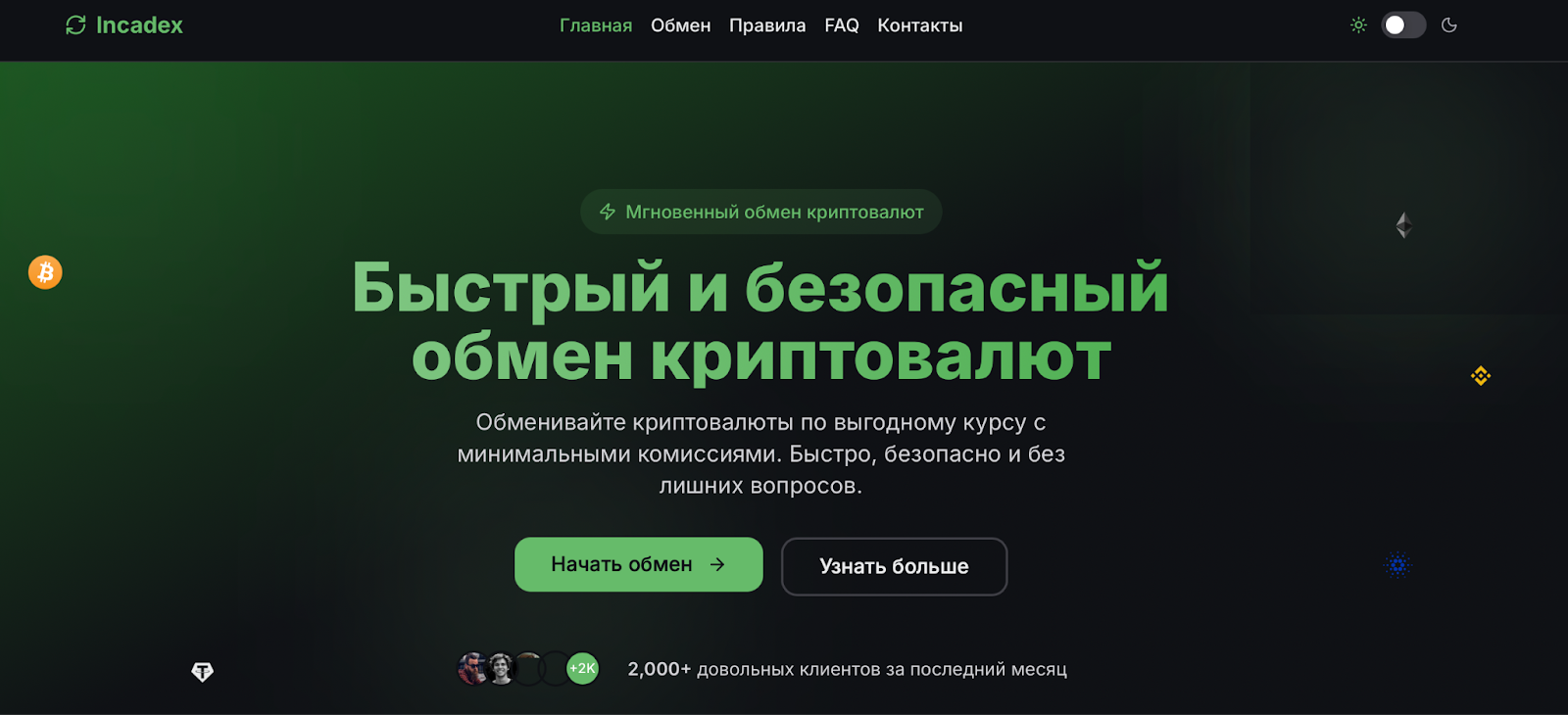 У конвертера практически нет присутствия в интернете за пределами собственного сайта и одного Telegram-профиля. Сам сайт incadex com — это классический шаблонный лендинг: темный фон, зеленые акценты, калькулятор обмена, большие кнопки «Начать обмен», блоки с преимуществами и таймерами акций. Все выглядит так примитивно, будто сайт собрали из готовых блоков за пару часов.