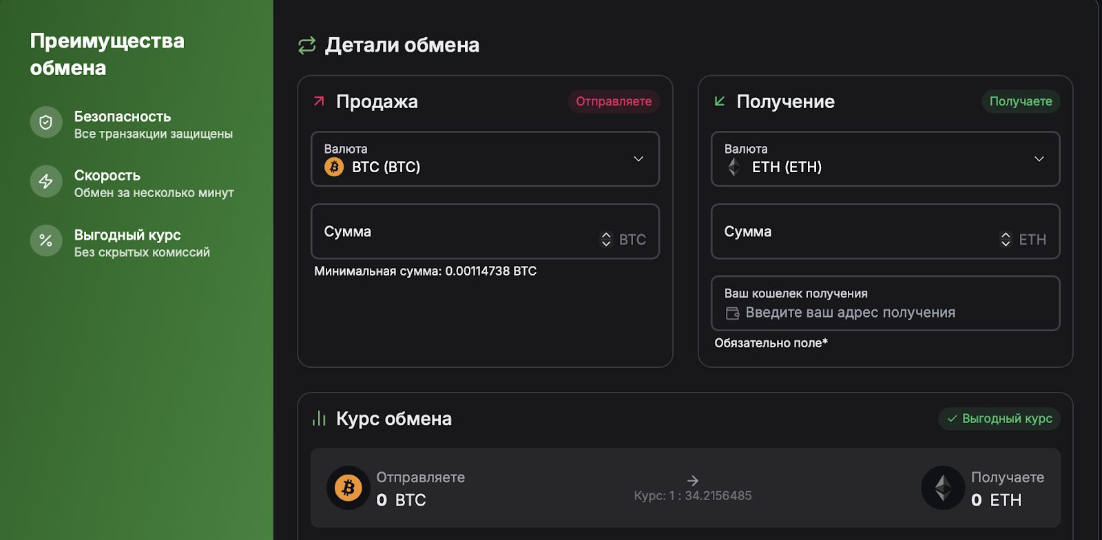 Ничего примечательного в сервисе нет — со стороны он выглядит как типичный конвертер. Работает он также по всем знакомой логике: выбираете пару обмена, вводите сумму, получаете адрес кошелька, отправляете крипту — и все готово.
