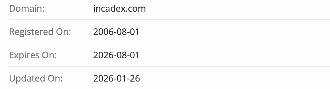 Домен incadex com существует уже больше 20 лет, но под обменник его явно перезапустили только в начале 2026 года. Раньше сайт либо стоял пустым, либо использовался под что-то совсем другое. Резкое превращение старого домена в «современный обменник с тысячами клиентов» — это классический прием мошенников: берут старый, чистый домен, чтобы не попасть в черные списки, и быстро раскручивают под новую схему.