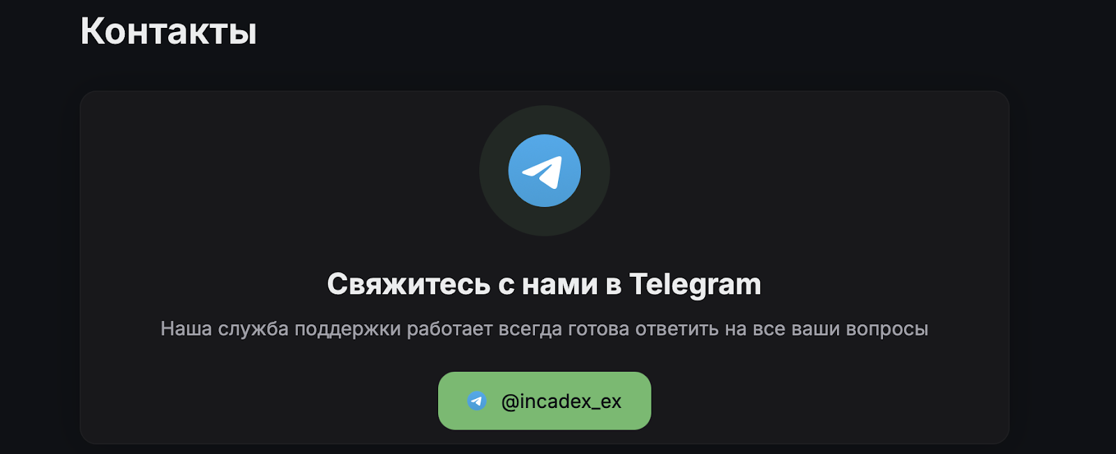 В качестве клиентского сервиса поддержки заявлен только телеграм-консультант Incadex Ex. Электронной почты, внутреннего чат-бота и номера телефона на сайте не указано. Также мы не нашли аккаунтов и профилей сервиса на сторонних платформах и в социальных сетях. Это сильно ограничивает взаимодействие представителей обменника с клиентами и в целом выглядит странно.