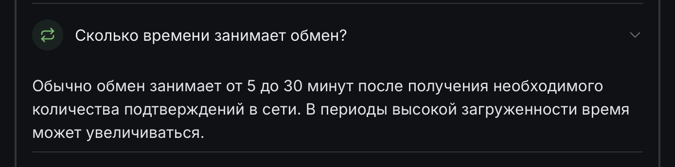 По данным сервиса, среднее время обменной операции — от 5 до 30 минут после нужного количества подтверждений в сети. В обычных условиях конвертирование якобы проводится быстро, но при высокой нагрузке на сеть может затянуться. Если задержка слишком сильная, советуют сразу писать в поддержку Telegram — обещают оперативно проверить статус и решить проблему.