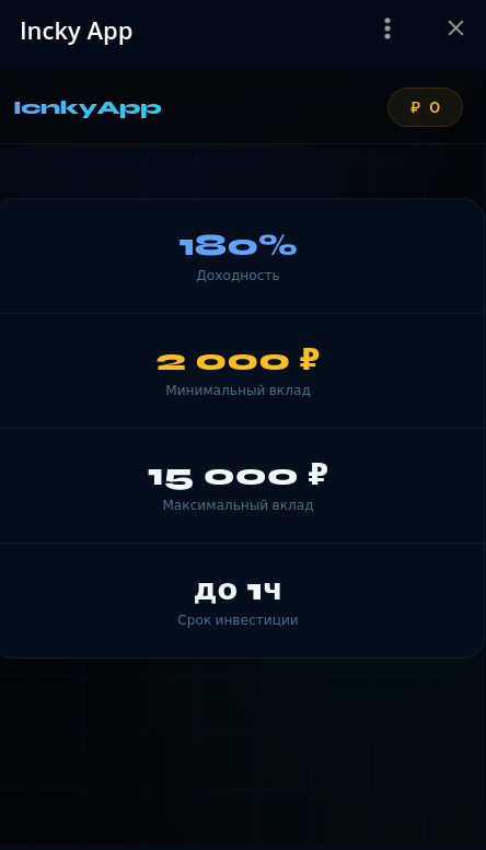 Внутри псевдо-сервиса InckyApp реализовано мини-приложение, которое имитирует инвестиционный терминал. Минимальный порог входа — 2 тыс. рублей, а верхняя планка ограничена 15 тыс. Встроенный калькулятор доходности уверенно показывает, что вложенная тысяча уже через 60 минут превратится в 2800 рублей.