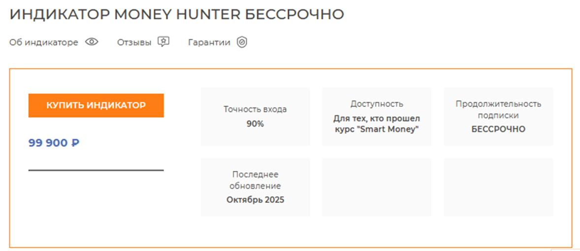 Торговый скрипт Мони Хантер платный. Его можно купить на специализированных платформах, например, на сайте Мир Трейдинга. Программа заявлена в качестве инструмента автоматизации на основе Smart Money. Ее можно подключать к популярным терминалам для быстрого определения точек входа. Полный функционал не указан, известно только, что скрип обеспечивает такие действия: