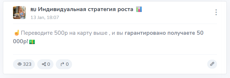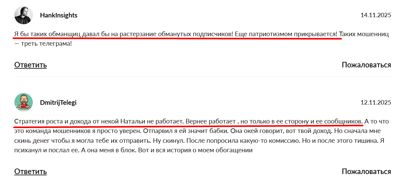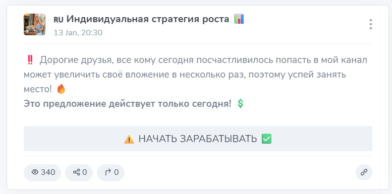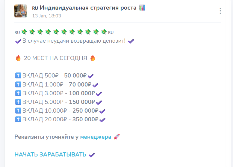“Только сегодня и только сейчас” актриса объявляет эксклюзивные предложения, а также постоянно держит подписчиков в курсе, какой лимит мест остался. Психологическое давление налицо. За минимальную инвестицию в 500 руб. фантазерша обещает стабильную выплату в 50 000, и всё это – в краткие сроки. По своему богатому опыту команда сообщников знает – жить каналу осталось недолго, до первых жалоб на сторонних сайтах в сети. Комментарии закрыты, иначе обворованные инвесторы сразу поделятся своим мнением о Наталье.
