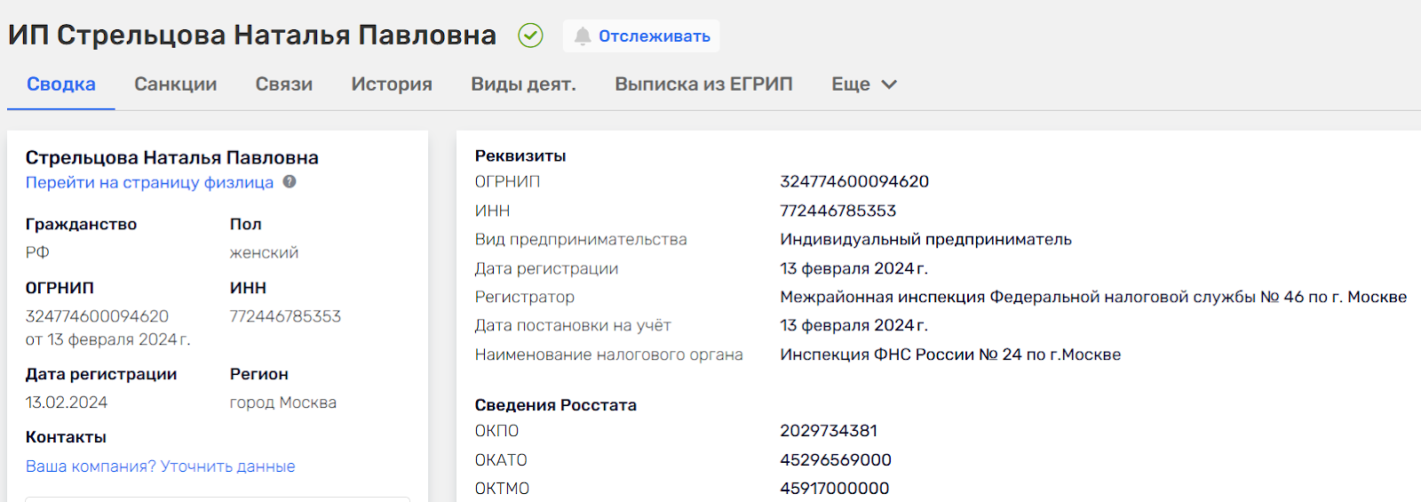 Убеждая в легальности заработка, в личной переписке присылаются сканы фальшивых паспортов, а на канале даются реквизиты чужих ИП. В рамках данного проекта выбор пал на предпринимателя Стрельцова Наталья Павловна, дополнительная деятельность которой вообще связана с отделкой тканей и производством текстильных изделий. Кража данных – не новинка для подобных сообществ.