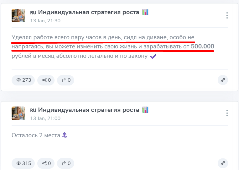 Предложения Натальи достаточно стандартные для подобного канала и с реальным заработком никак не связаны. Как и многие жулики, финансовая наставница предлагает сомнительную рекомендацию – гарантированно заработать полмиллиона, сидя пару часов на диване.