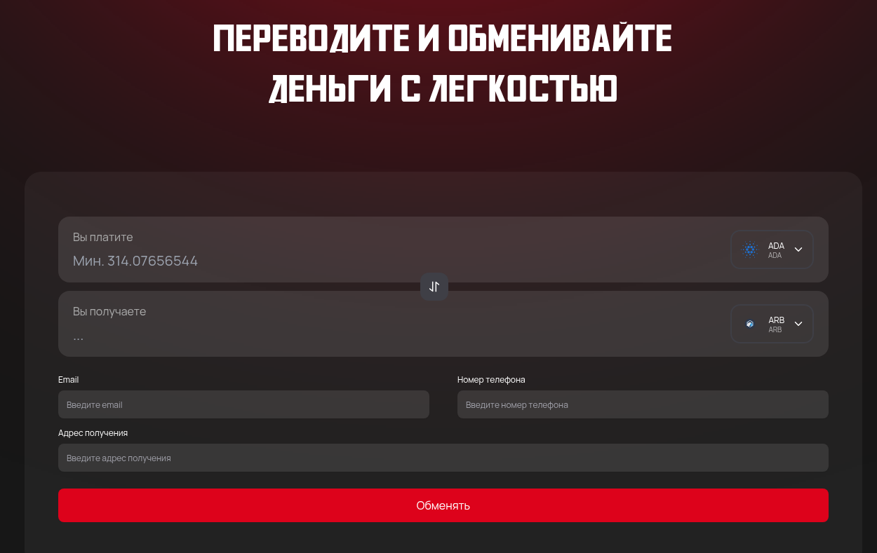 Платформа обещает быстрое транзакции, подчеркивает, что у них одни из лучших курсов на рынке и высокая надежность. Предлагают обмен как распространенных валют по типу BTC и USDT, так и более экзотических — ADA, ARB и т.д.
