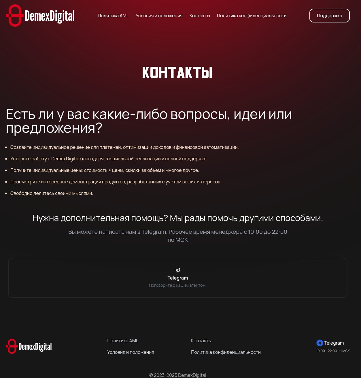 По факту сервис не предлагает ничего нового в обмене криптовалют. У него тот же самый набор функций и возможности, что и у конкурентов. Есть реферальная программа для заработка на привлеченных пользователях. Но ее условия не описаны, а при клике на кнопку получить ссылку переадресовывает в Телеграм на аккаунт менеджер @demexdigital_com.