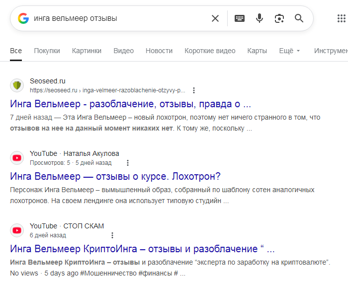На сегодняшний день на просторах сети о деятельности Inga Velmeer нет подробностей. При этом она пишет, что работает с 2018 года, но наша проверка показала, что в интернете девушка появилась 1,5 месяца назад. Нет уверенности, что блогер является настоящим инвестором и специалистом по криптовалюте, так как подтверждений этому она не предоставляет.