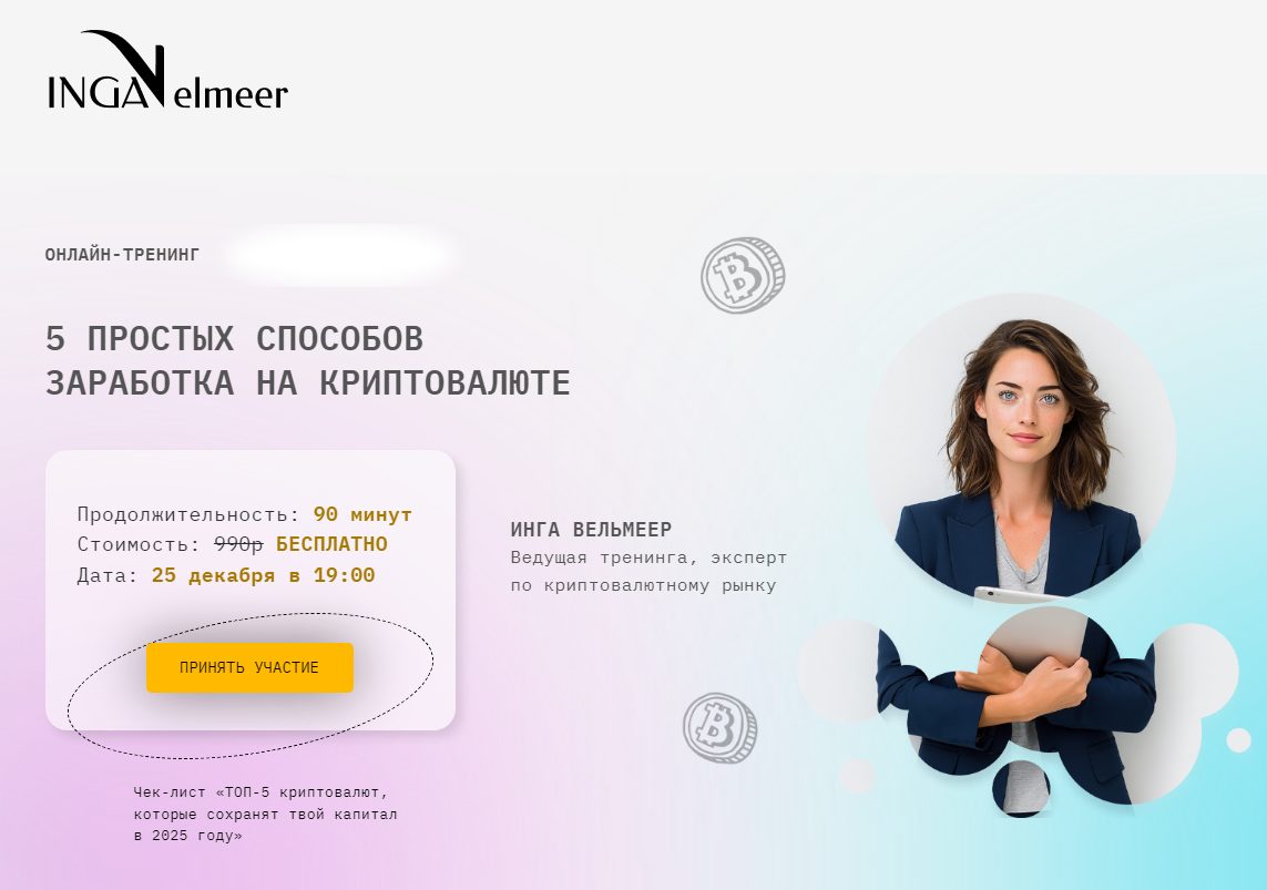 Сегодня у нас на проверке некая Inga Velmeer, которая позиционирует себя как успешного спикера и эксперта по криптовалюте. На ее официальном сайте Cryptoinga Ru сейчас висит объявление о бесплатном онлайн-вебинаре, который состоится 25 декабря. Площадка выглядит непрезентабельно. Здесь нет информационных разделов, документации и так далее.