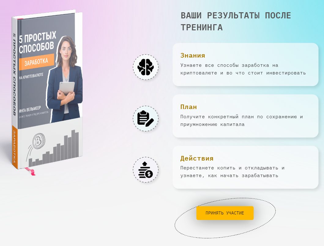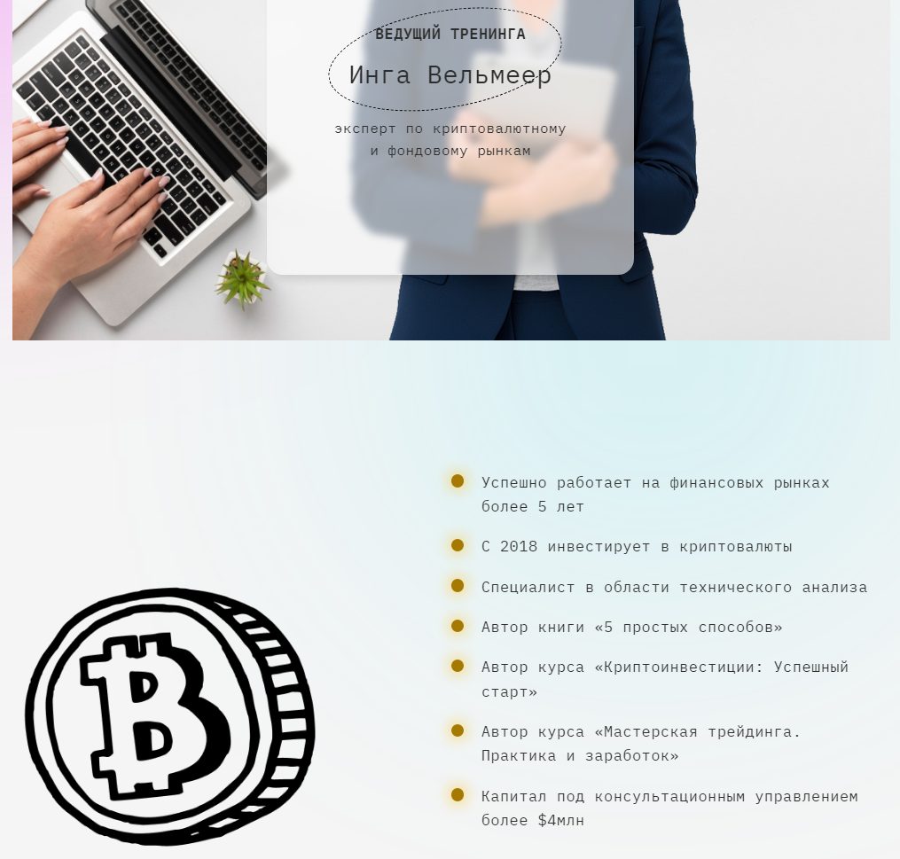 Инга Вельмеер — эксперт с 7-ми летним стажем по криптовалютному и фондовому рынкам, автор курсов по заработку на крипте и трейдинге. Успешной репутацией она не обладает и известной не является. В этой статье мы проанализируем деятельность данной личности и постараемся выяснить, стоит ли у нее обучаться или это скам.