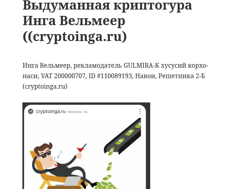 Социальных сетей, где можно наглядно увидеть студентов, нет. Инга Вельмеер специально скрывает любые контакты для связи, чтобы не отвечать на неудобные вопросы. Однако кое-какая информация на сайте есть: код VAT :200000707, адрес офиса — GULMIRA-K хусусий корхонаси, Навоиийская область, город Навои, улица Решетника, 2-Б. Также есть почта — support cryptoinga ru, по которой никто не отвечает.