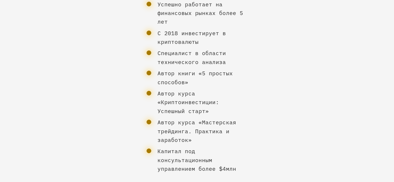 • Успешная работа на разных финансовых рынках свыше 5 лет. Подтверждений этого тоже нет, поэтому не исключаем очередной блеф.