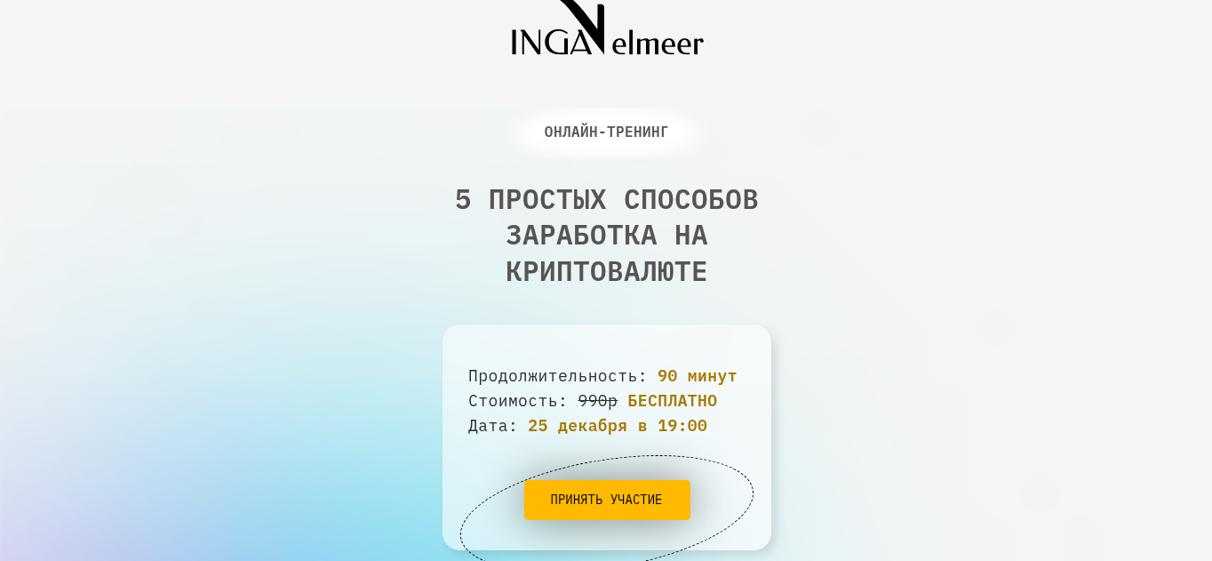 На одностраничнике лектор предлагает участие в онлайн-тренинге «5 простых способов заработка на криптовалюте». Ранее стоимость была 990 рублей, но теперь бесплатно. Старт 25 декабря 2025 года. Бесплатная образовательная программа — воронка от Инги Вельмеер, чтобы заманить пользователей для дальнейшего сотрудничества.