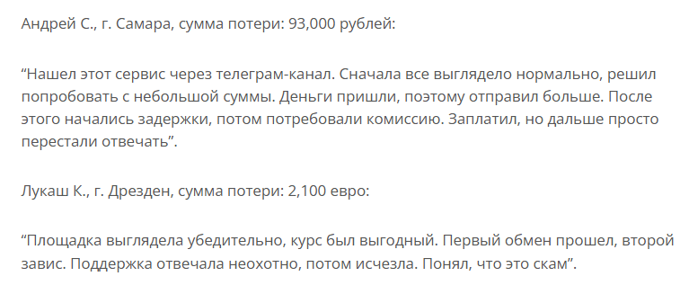Мы не нашли ни одного положительного отзыва в интернете. В комментариях люди жалуются на мошенничество. Рассказывают, что аферисты пропускают небольшие суммы, втираются в доверие, но крупные обмены замораживают, а деньги присваивают себе.