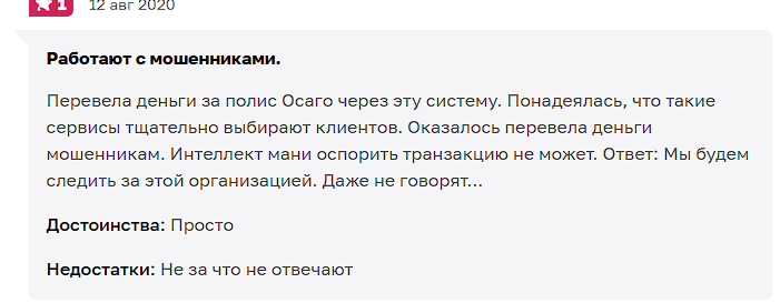 Также встречаются жалобы на необъяснимые списания средств и скрытые комиссии. А ещё – на технические сбои, но такие случаи были в основном в 2010-х. Гораздо более серьёзная претензия заключается в том, что сервис Intellect Money якобы может сотрудничать со скам проектами.