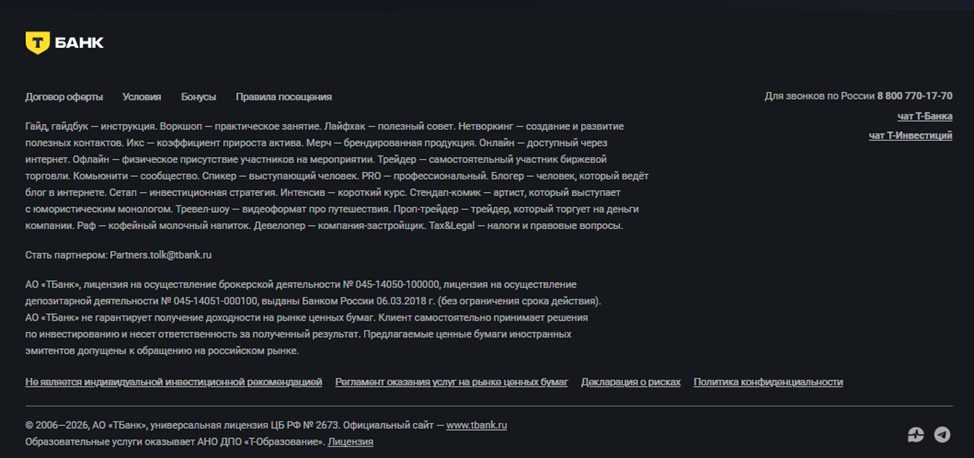 Вся информация про финансовый практикум доступна на официальной платформе T Tolk Ru. Мероприятие проводят под эгидой АО «Т-Банк». У организации есть все необходимые лицензии не только на организацию образовательных семинаров, но и на банковскую, а также на инвестиционную деятельность.