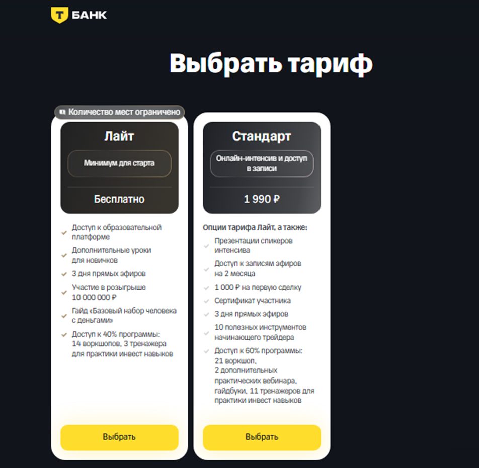 • «Стандарт» за 1 990 рублей — доступ ко всем онлайн-занятиям и презентациям, а также бонус в 1 тыс. рублей на первую сделку на платформе «Т-инвестиции».