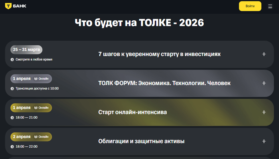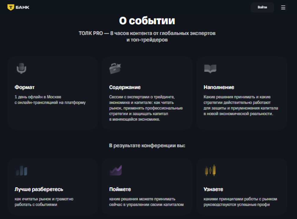 Кроме онлайн-мероприятий, в повестке TTolk значится офлайн-конференция «Толк PRO». Участников ждет 8 часов живого общения с глобальными экспертами и топ-трейдерами. Среди заявленных хедлайнеров:
