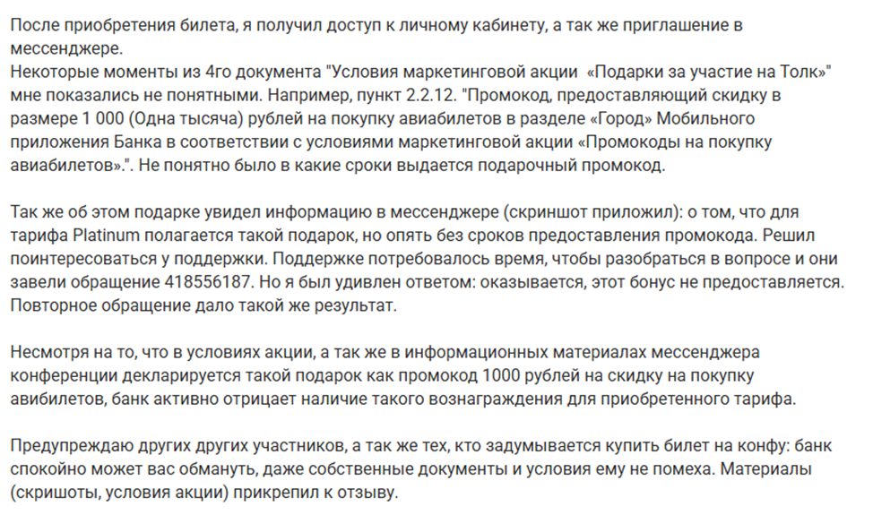 Некоторые участники заявляют об обмане. Организаторы обещали покупателям билетов подарить 1 000 рублей на первую сделку, но изменили условия акции, не уведомив клиентов.