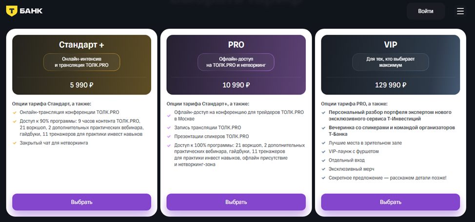 «Т-Толк» — фундаментальное мероприятие, где реально можно прокачать свои навыки инвестора, а также получить эксклюзивные знания и советы от ведущих экспертов отрасли. Мы рекомендуем приобщиться к этому интенсиву, но советуем ответственно отнестись к выбору тарифа — кому-то достаточно бесплатного доступа, а другим важно задать вопросы спикерам и получить профессиональную оценку личного инвестиционного портфеля.