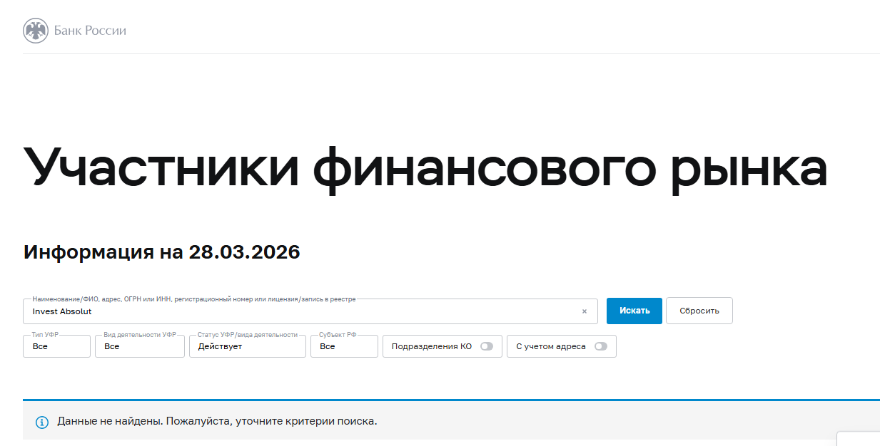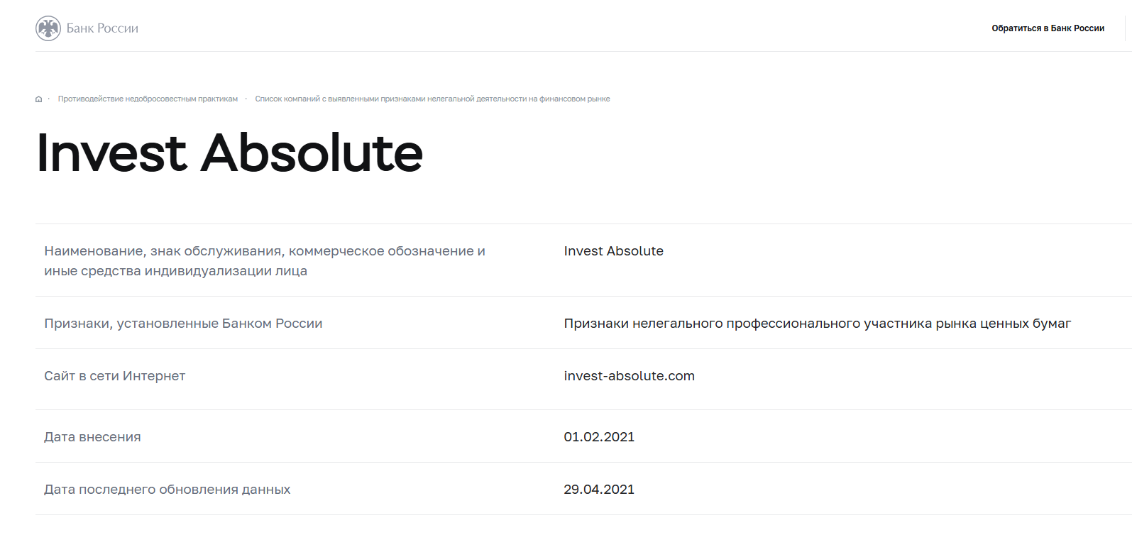 Invest Absolut – брокерская платформа. Завлекает клиентов выгодными условиями торговли активами, но ведет свою деятельность незаконно. Подробнее расскажем далее.