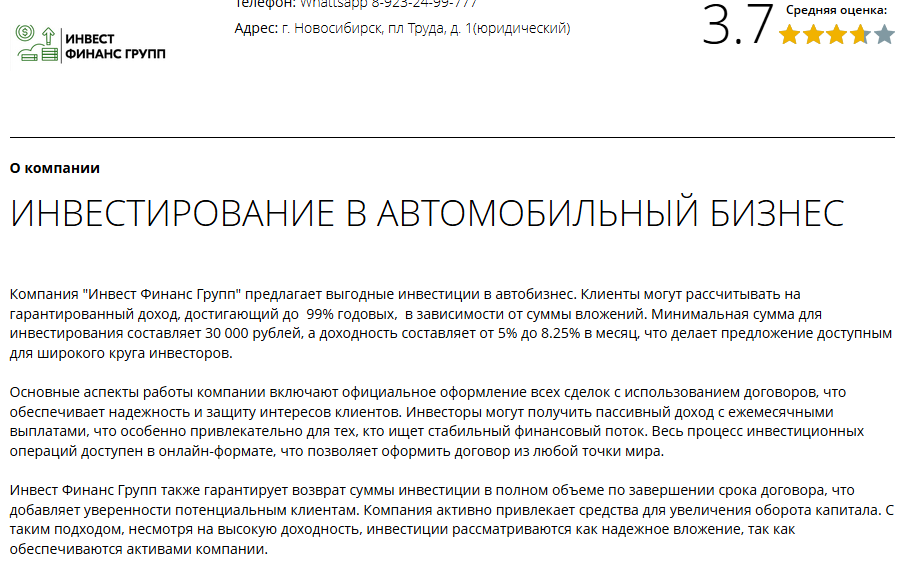 Отметим, что из-за типичного названия компании проект можно перепутать с массой других организаций. С таким же названием есть управляющая компания, инвестиционная группа компаний и другие. Однако об организации из Новосибирска Инвест финанс групп скудное количество отзывов. На проекте заявлена высокая доходность для вкладчиков, при этом финансовые показатели фирмы не впечатляют. Мнений юзеров, которые воспользовались основной услугой по покупке или продаже авто, в сети мало. Клиентам и инвесторам рекомендуется проверять актуальные отклики о проекте.