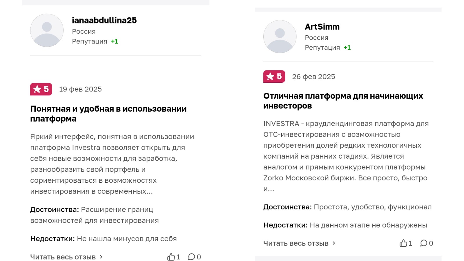 В сети есть положительные отзывы об Инвестра РФ, и в них пишут о понятном функционале, больших возможностях для инвестирования.