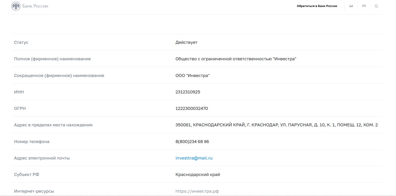 Инвестиционная платформа Инвестра была создана в 2022 году. Она зарегистрирована в Краснодарском крае. Директором выступает Юферев Эдуард Геннадьевич. Исходя из официальных данных, уставный капитал компании составляет 5 млн рублей. У проекта есть лицензия от Центрального Банка РФ с 2023 года.