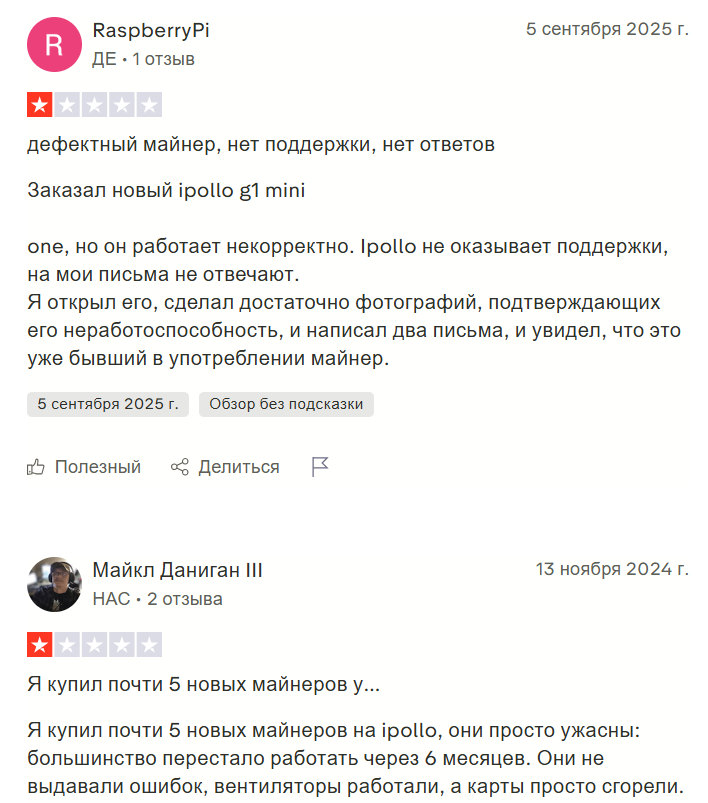 Тем не менее, встречаются также комментарии с отрицательными впечатлениями о данном бренде и его оборудовании под майнинг. Люди пишут, что консультанты не помогали им решать вопросы. Также некоторые пользователи прямо заявляют, что Ipollo лохотрон и отмечают дефекты оборудования. Еще есть нарекания на ошибки в работе и сбои, а также быстрый выход из строя видеокарт.