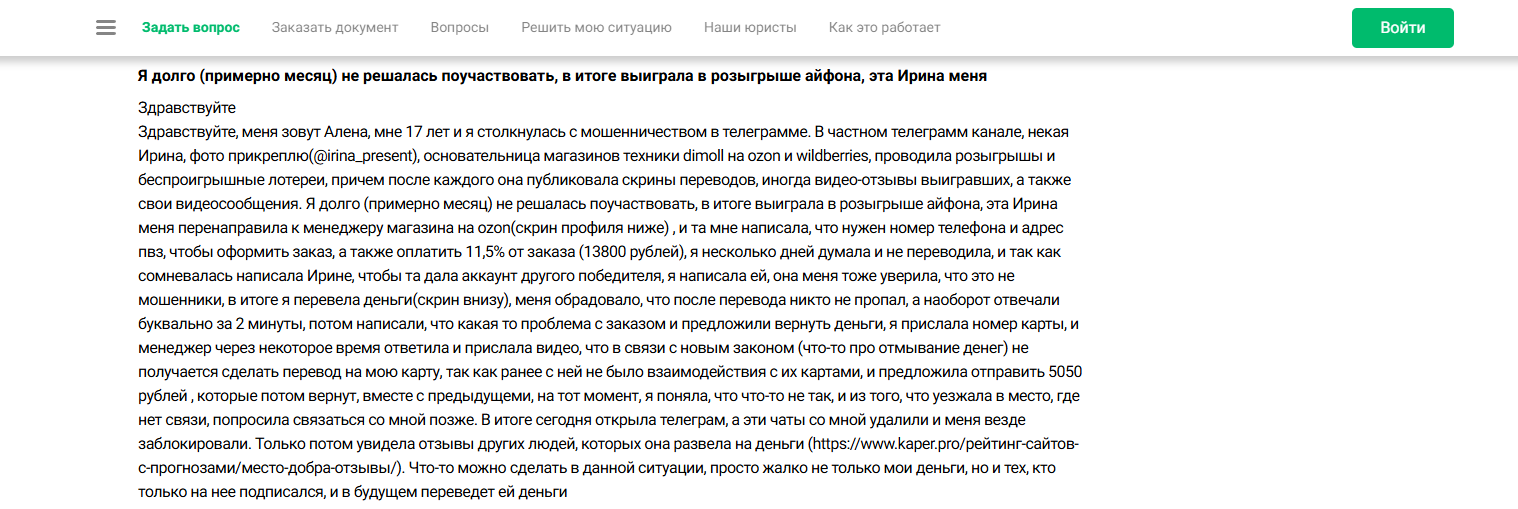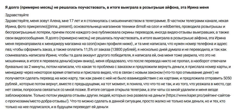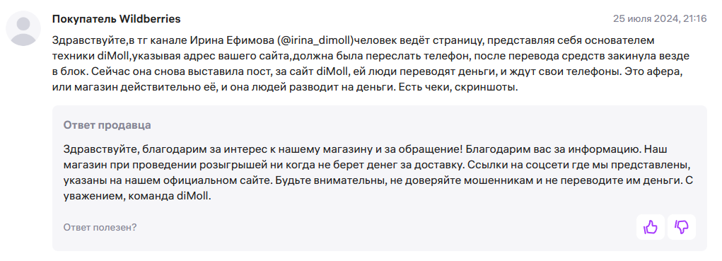 Важно сказать, что при поиске обращений пользователей в Ozon / WildBerries к магазину ДиМолл, нашлось найти тикеты, где они спрашивают о проведении подобных розыгрышей с предоплатой приза. Там команда DiMoll ответила, что никаких денег они не берут, а все официальные ссылки есть на их сайте, из-за чего группу в телеграмме Irina Darit с розыгрышами айфона, лучше обходить стороной.