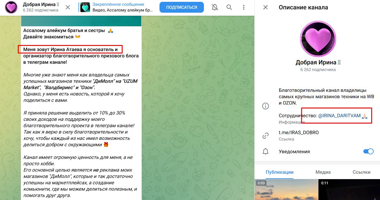 Также при анализе тг канала Ирина Дарит, где предпринимательница проводит конкурс можно заметить изменение имени. Сейчас она оставляет ссылку на профиль под фамилией Новикова, но ранее в этой же ленте встречались фамилии Анварова и Атаева. Обычный человек вряд ли так часто меняет ФИО без причины. Вдобавок она представляется владельцем магазина техники DiMoll, но ссылки / других подтверждений этому нет.