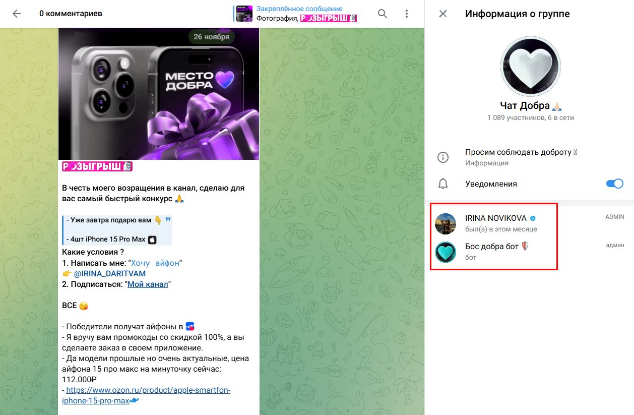 При анализе тг канала Irina Darit также вопросы вызывает и прозрачность, правда в том, что комментарии открыты, но на деле это обман. В списке участников есть некий бот, “Босс Добра”, который создан непосредственно Ириной. Вообще владельцы тгк редко создают своих ботов, а также дают им доступ к комментариям, а из-за подозрения в мошенничестве и полного отсутствия сообщений можно сказать наверняка, что именно он удаляет все сообщения от подписчиков. Это классическая в последнее время схема, которая позволяет создать иллюзию открытости, накрутить ботов, но при этом запретить жертвам предупредить остальных людей.