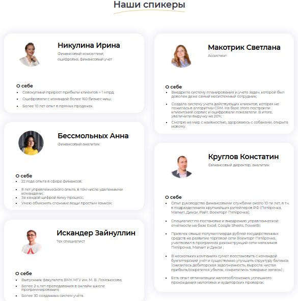 На сайте представлено пять спикеров – подробных карточек для изучения сканов документов экспертов нет.